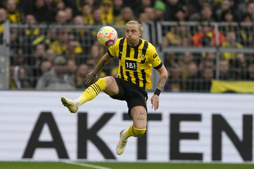 Dortmund's Marius Wolf controls the ball during the German Bundesliga soccer match between Borussia Dortmund and SC Freiburg in Dortmund, Germany, Saturday, Feb. 4, 2023. (AP Photo/Martin Meissner)