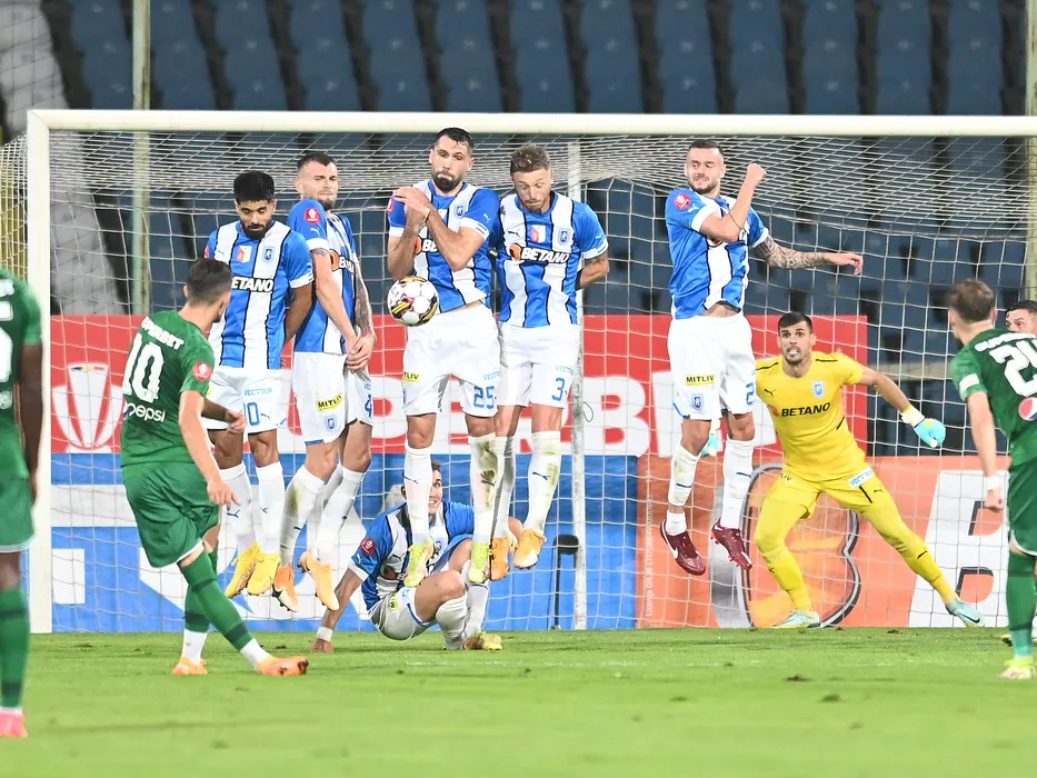 Zid craiovean format din Ionut Daniel Vina, Alexandru Cretu, Valerica Marius Gaman, Bogdan Alexandru Mitrea si Ivan Martic alaturi de portarul David Beniamin Lazar in meciul de fotbal dintre Universitatea Craiova si Farul Constanta, contand pentru Superliga Superbet, desfasurat pe Stadionul Municipal din Drobeta Turnu Severin, luni 5 septembrie 2022. © FOTO:Razvan Pasarica/SPORT PICTURES