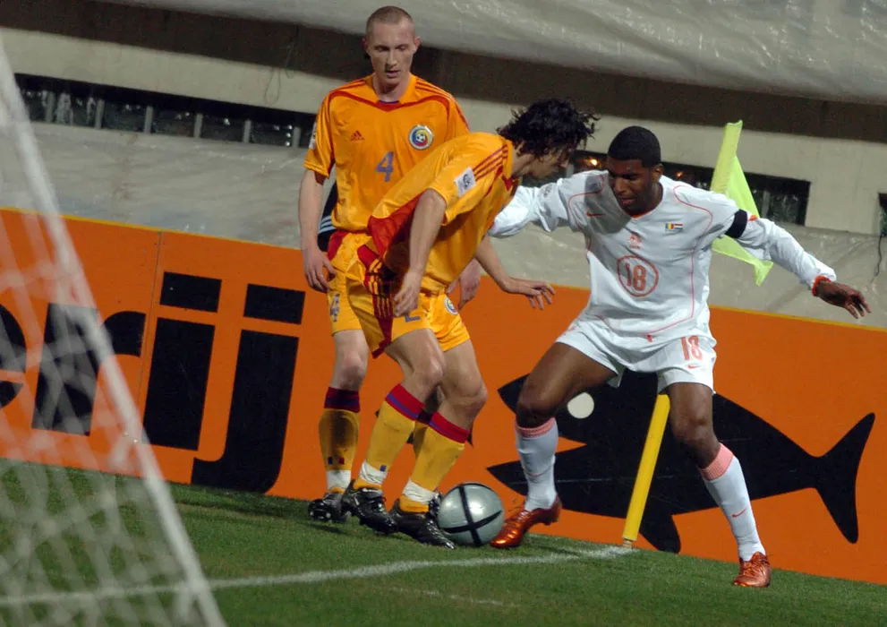 Echipa nationala de fotbal a Romaniei a fost invinsa, simbata, pe stadionul Giulesti, cu scorul de 2-0 (1-0) de selectionata Olandei, intr-un meci din cadrul preliminariilor CM 2006. In imagine, Ghioane Tiberiu, Ogararu George si Babel Ryan