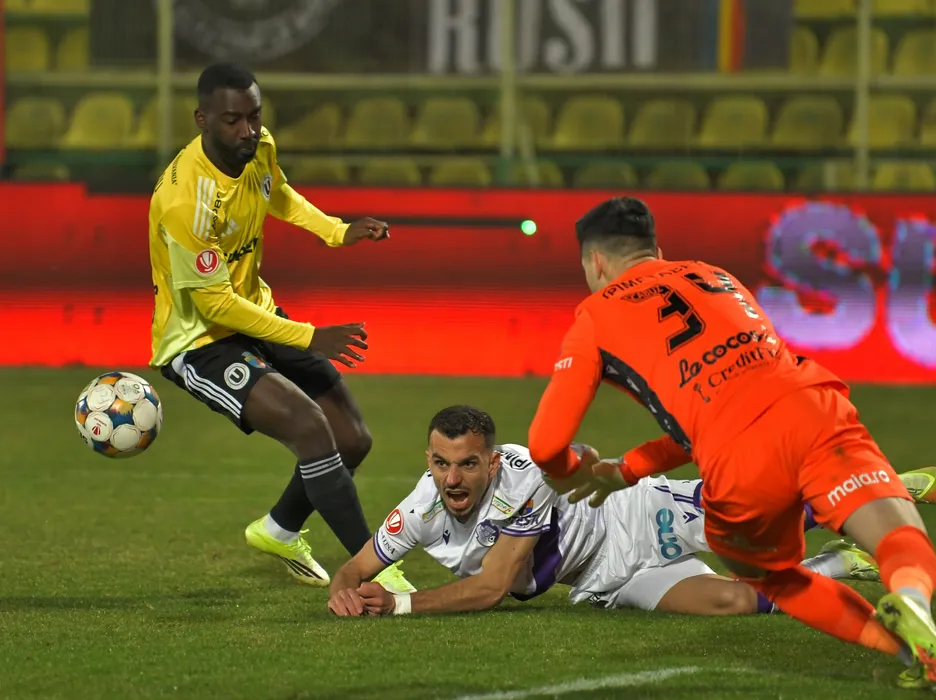 Issouf Macalou si Leard Sadriu, Catalin Vasile Cabuz in meciul de fotbal dintre FC Arges si FC Universitatea Cluj, contand pentru Superliga Superbet Play-Off, desfasurat pe Stadionul Orasenesc din Mioveni, sambata 21 martie 2026. © FOTO:Mihai Nitoiu/SPORT PICTURES