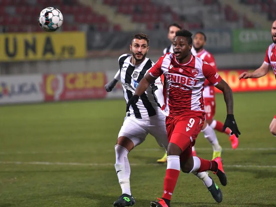 Mattia Montini si Magaye Serigne Gueye in meciul de fotbal dintre Astra Giurgiu si Dinamo Bucuresti, contand pentru Liga 1 Casa Pariurilor, desfasurat fara spectatori pe Stadionul Marin Anastasovici din Giurgiu, duminica 21 februarie 2021. © FOTO:Razvan Pasarica/SPORT PICTURES