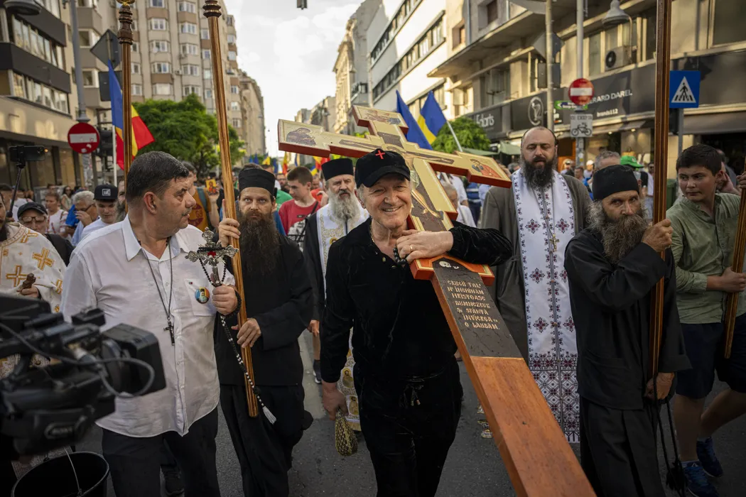 Gigi Becal tine o cruce in timpul unei contramanifestatii organizate de asociatia ''Fratia Ortodoxa'' fata de marsul comunitatii LGBTQ+ ''Bucharest Pride 2023'', in Bucuresti, duminica, 30 iulie 2023. Aproximativ 100 de persoane purtand cruci, icoane si agheasma au participat, duminica, la un mars de ''izgonire a duhurilor necurate lasate in urma de parada LGBTQ'' conform organizatorilor, pe acelasi traseu ca participantii la Bucharest Pride 2023. ANDREEA ALEXANDRU / MEDIAFAX FOTO