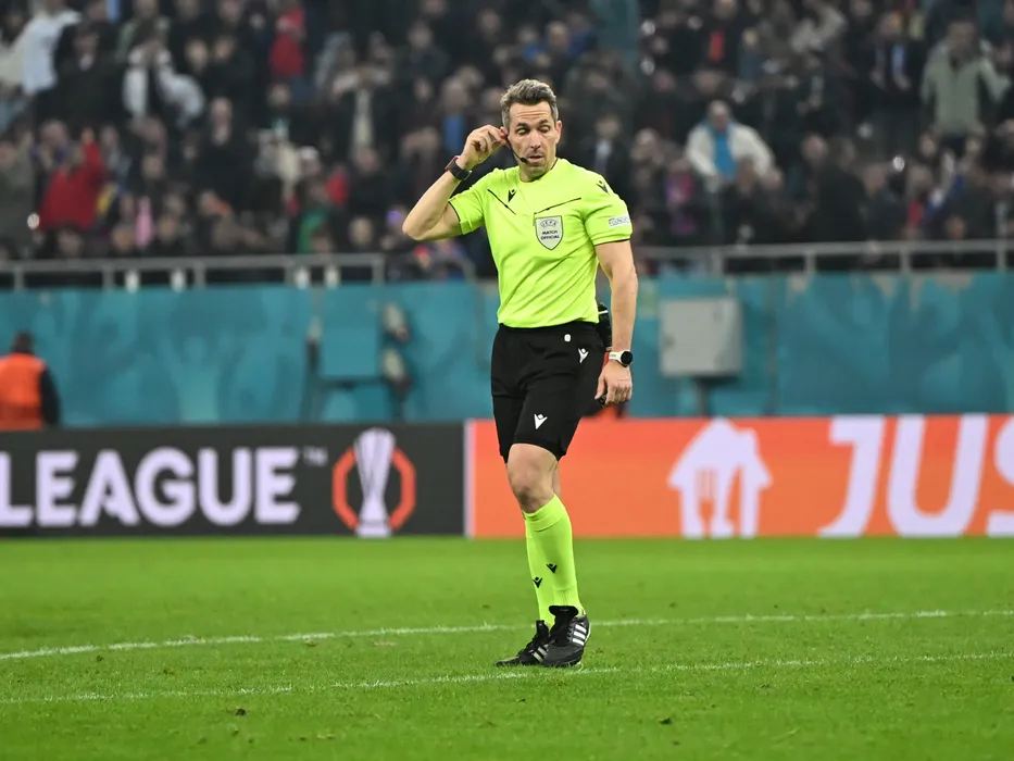 Arbitrul central Tobias Stieler reacționează in meciul de fotbal dintre FCSB si Olympique Lyon, din cadrul UEFA Europa League, desfasurat pe Arena Nationala din Bucuresti, joi 6 martie 2025. © FOTO:Razvan Pasarica/SPORT PICTURES