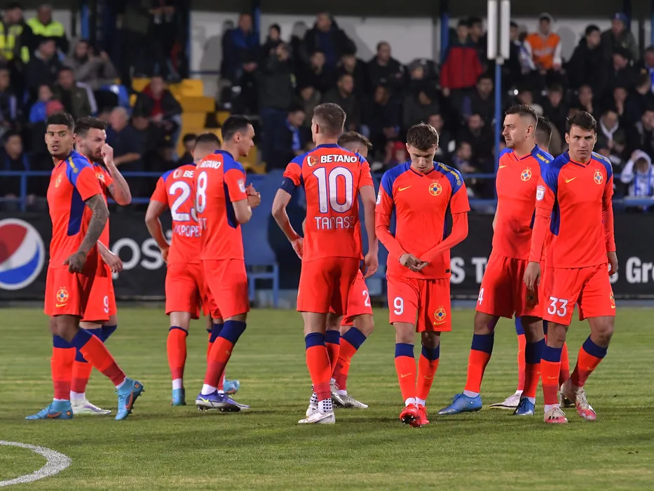 Fotbalistii stelisti printre care Octavian George Popescu, Andrei George Miron si Risto Radunovic in meciul de fotbal dintre Farul Constanta si FCSB, contand pentru Play off-ul Ligii 1 Casa Pariurilor, desfasurat pe Stadionul central al Academiei Gheorghe Hagi din Ovidiu, luni 25 aprilie 2022. © FOTO:Razvan Pasarica/SPORT PICTURES