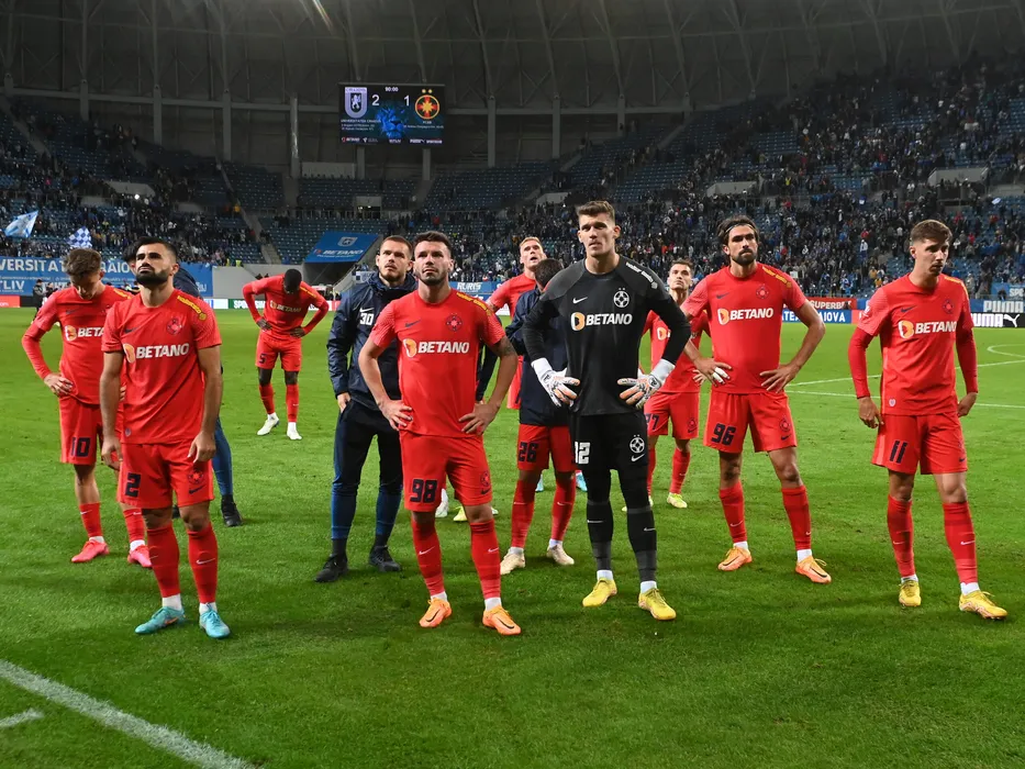 Fotbalistii stelisti Octavian George Popescu, Valentin Cretu, Denis Gratian Harut, Andrei Ioan Cordea, Stefan Tarnovanu, Andrea Compagno si David Raul Miculescu suparati dupa meciul de fotbal dintre Universitatea Craiova si FCSB, contand pentru Superliga Superbet, desfasurat pe Stadionul Ion Oblemenco din Craiova, duminica 18 septembrie 2022. © FOTO:Razvan Pasarica/SPORT PICTURES