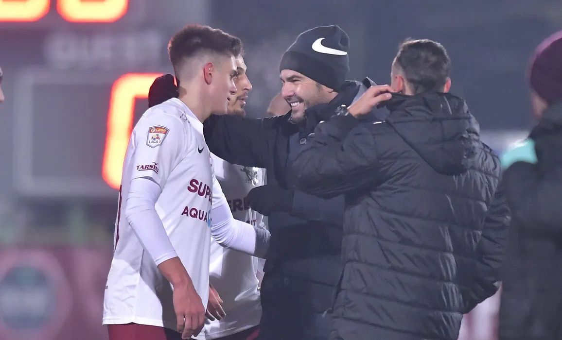 Adrian Mutu il felicita pe Rares Andrei Ilie dupa meciul de fotbal dintre Rapid Bucuresti si Academica Clinceni, contand pentru Liga 1 Casa Pariurilor, desfasurat pe Stadionul Orasenesc din Mioveni, sambata 5 martie 2022. © FOTO:Razvan Pasarica/SPORT PICTURES