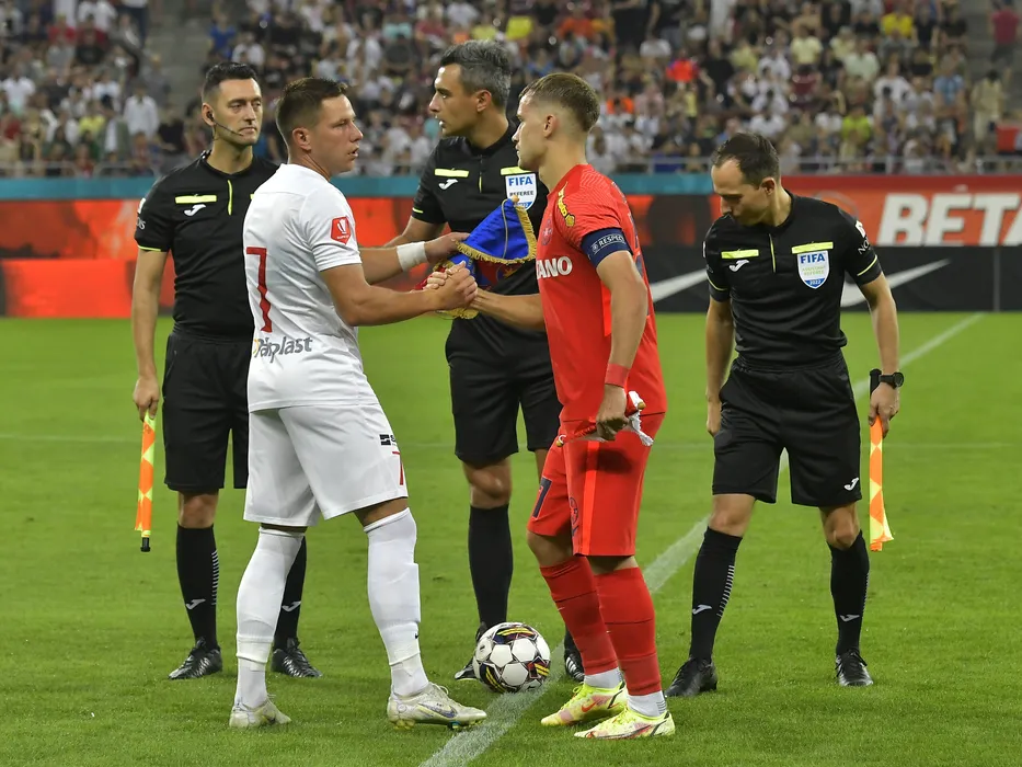 Brigada de arbitri formata din Valentin Avram, Horatiu Mircea Fesnic si Alexandru Cerei alaturi de capitanii Ionut Petrisor Petrescu si Darius Dumitru Olaru in meciul de fotbal dintre FCSB si FC Hermannstadt, contand pentru Superliga Superbet, desfasurat pe Arena Nationala din Bucuresti, duminica 28 august 2022. © FOTO:Razvan Pasarica/SPORT PICTURES