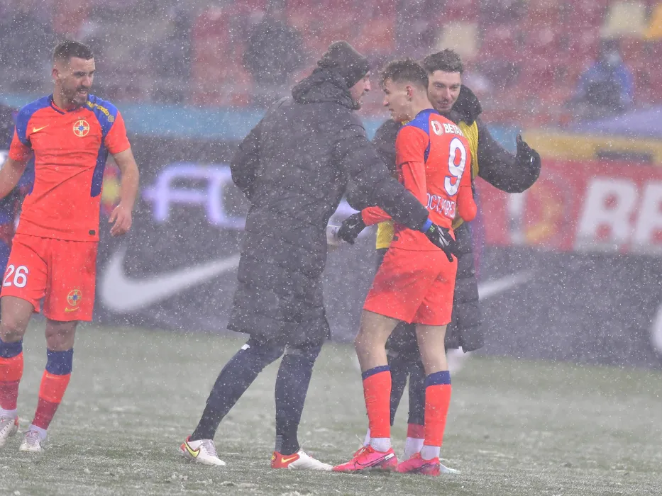 Catalin George Straton, Andrei Burlacu si Razvan Constantin Oaida il felicita pe Octavian George Popescu dupa un gol marcat in meciul de fotbal dintre FCSB si FC Voluntari, contand pentru Liga 1 Casa Pariurilor, desfasurat pe Arena Nationala din Bucuresti, duminica 6 martie 2022. © FOTO:Razvan Pasarica/SPORT PICTURES