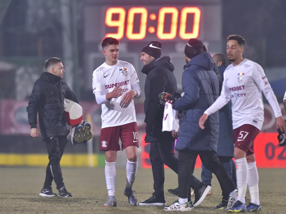 Adi Mutu îl felicită pe Rareș Ilie la finalul meciului câștigat de Rapid cu Academica Clinceni, scor 1-0, în etapa 30 din Liga 1.