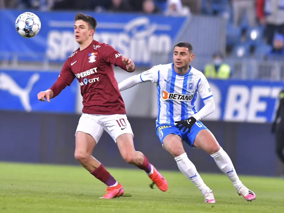 Rares Andrei Ilie si Screciu Vladimir Ionut in meciul de fotbal dintre Universitatea Craiova si Rapid Bucuresti, contand pentru Liga 1 Casa Pariurilor, desfasurat pe Stadionul Ion Oblemenco din Craiova, sambata 22 ianuarie 2022. © FOTO:Razvan Pasarica/SPORT PICTURES