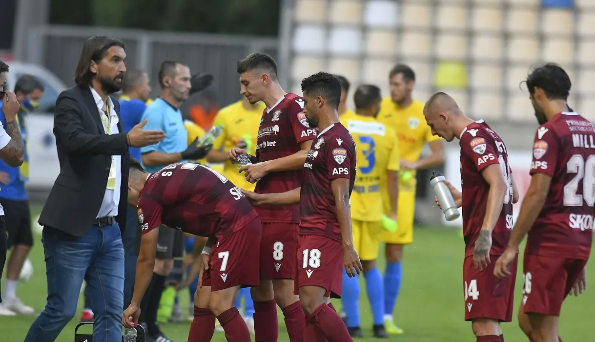 Dan Alexa alaturi de fotbalistii rapidisti printre care Rares Lazar la o pauza de hidratare in meciul de fotbal dintre Petrolul Ploiesti si Rapid Bucuresti, contand pentru play-off-ul de promovare a Ligii a-2-a Casa Pariurilor, disputat fara spectatori pe Stadionul Ilie Oana din Ploiesti, sambata 11 iulie 2020. © FOTO:Razvan Pasarica/SPORT PICTURES