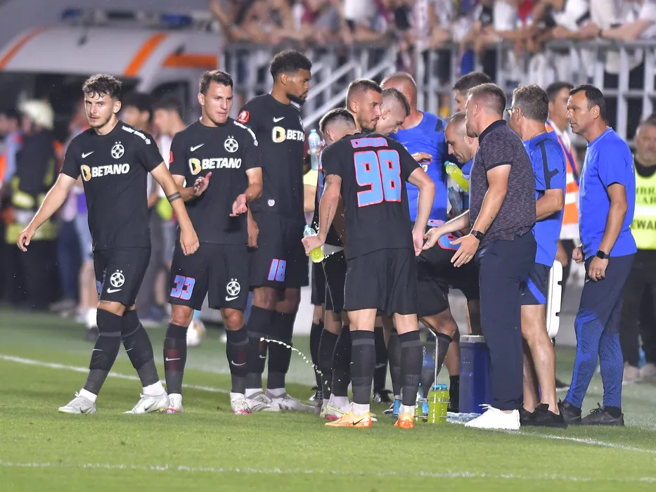 Fotbalistii stelisti Ianis Ilie Stoica, Risto Radunovic s18/ si Razvan Constantin Oaida la o pauza de hidratare alaturi de antrenorul lor Toni Petrea in meciul de fotbal dintre Rapid Bucuresti si FCSB, contand pentru Superliga Superbet, desfasurat pe Stadionul Rapid Giulesti din Bucuresti, duminica 24 iulie 2022. © FOTO:Razvan Pasarica/SPORT PICTURES