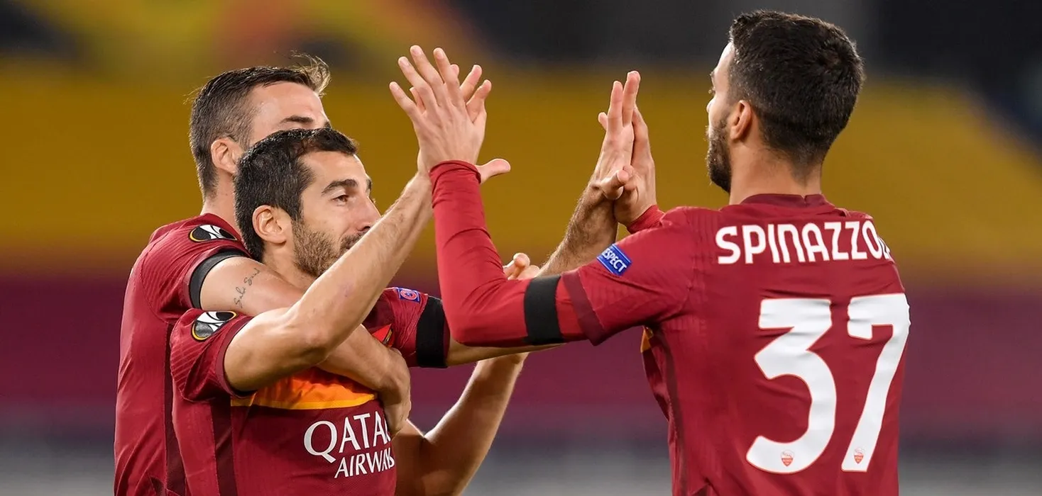 Henrikh Mkhitaryan of AS Roma celebrates with Leonardo Spinazzola after scoring the goal of 1-0 during the Europa League Group Stage A football match between AS Roma and CFR 1907 Cluj at Olimpic stadium in Rome (Italy), November, 5th, 2020. Photo Antonietta Baldassarre / Insidefoto/Sipa USA,Image: 567593451, License: Rights-managed, Restrictions: *** World Rights Except Germany, Italy, Japan, and The Netherlands ***, Model Release: no