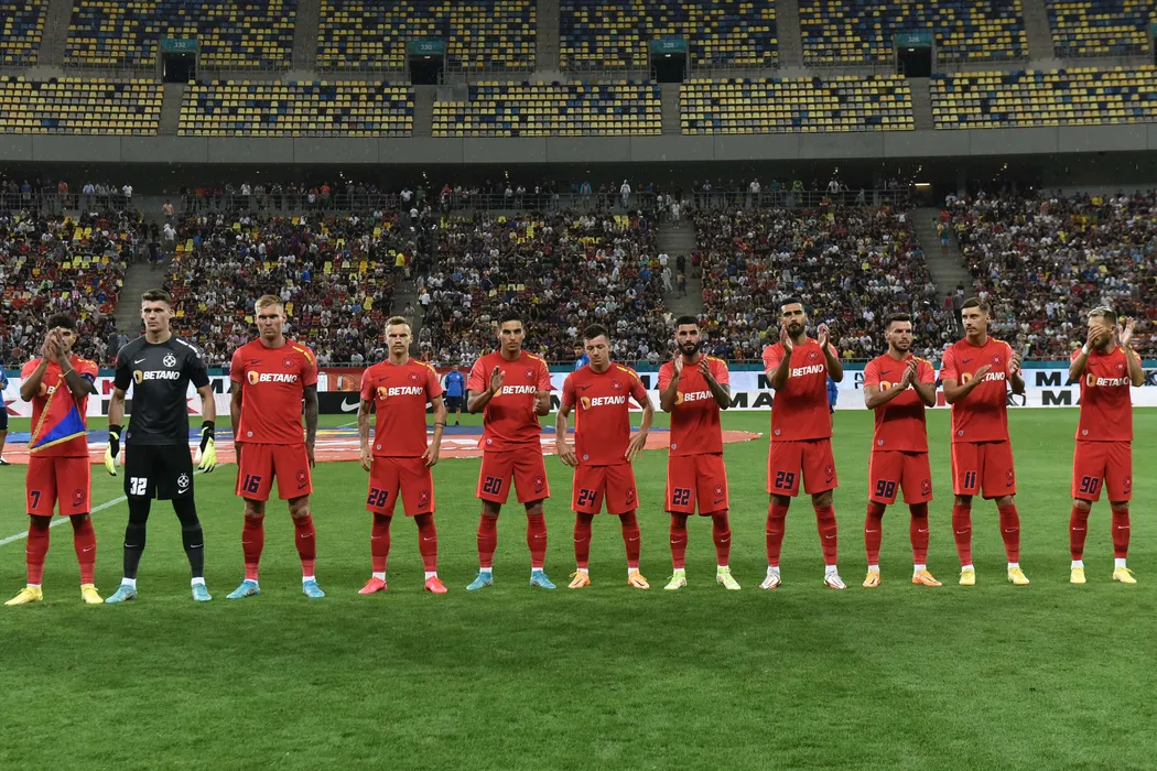 Fotbalistii stelisti la startul meciului de fotbal dintre FCSB si Chindia Targoviste, contand pentru Superliga Superbet, desfasurat pe Arena Nationala din Bucuresti, duminica 14 august 2022. © FOTO:Razvan Pasarica/SPORT PICTURES