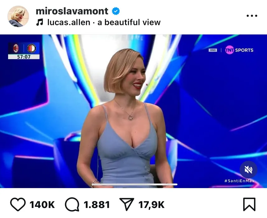 „Dumnezeu a fost inspirat de frumusețea ta”. Miroslava i-a fascinat pe telespectatorii Champions League cu apariția ei cu decolteu adânc