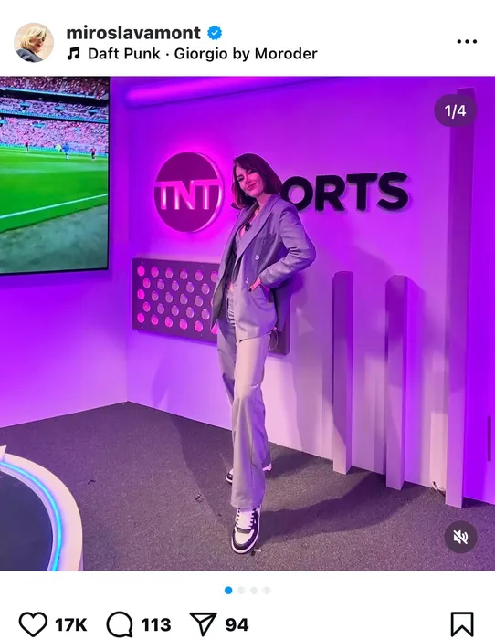 „Dumnezeu a fost inspirat de frumusețea ta”. Miroslava i-a fascinat pe telespectatorii Champions League cu apariția ei cu decolteu adânc