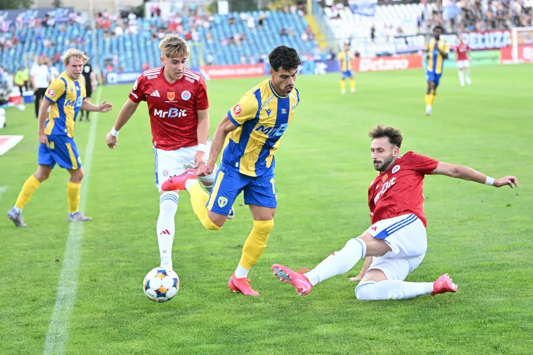 Matei Frunza, Valentin Gheorghe si Razvan Alin Trif in meciul dintre Otelul Galati si Petrolul Ploiesti, contand pentru Superliga Superbet, desfasurat pe Stadionul Otelul din Galati, duminica 13 iulie 2025. © FOTO:Razvan Pasarica/SPORT PICTURES