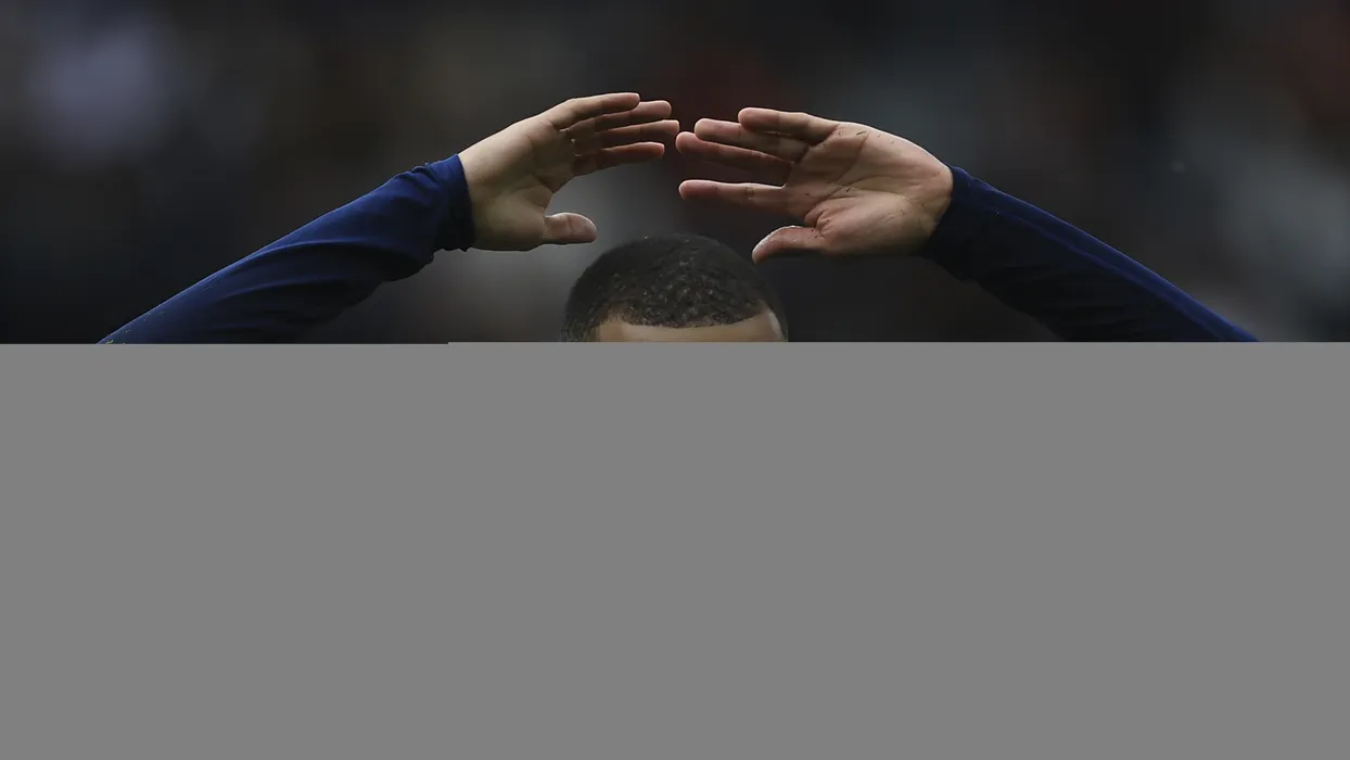 PSG's Kylian Mbappe reacts during the French League One soccer match between Paris Saint-Germain and Lorient, at the Parc des Princes stadium in Paris, Sunday, April 30, 2023. (AP Photo/Aurelien Morissard)