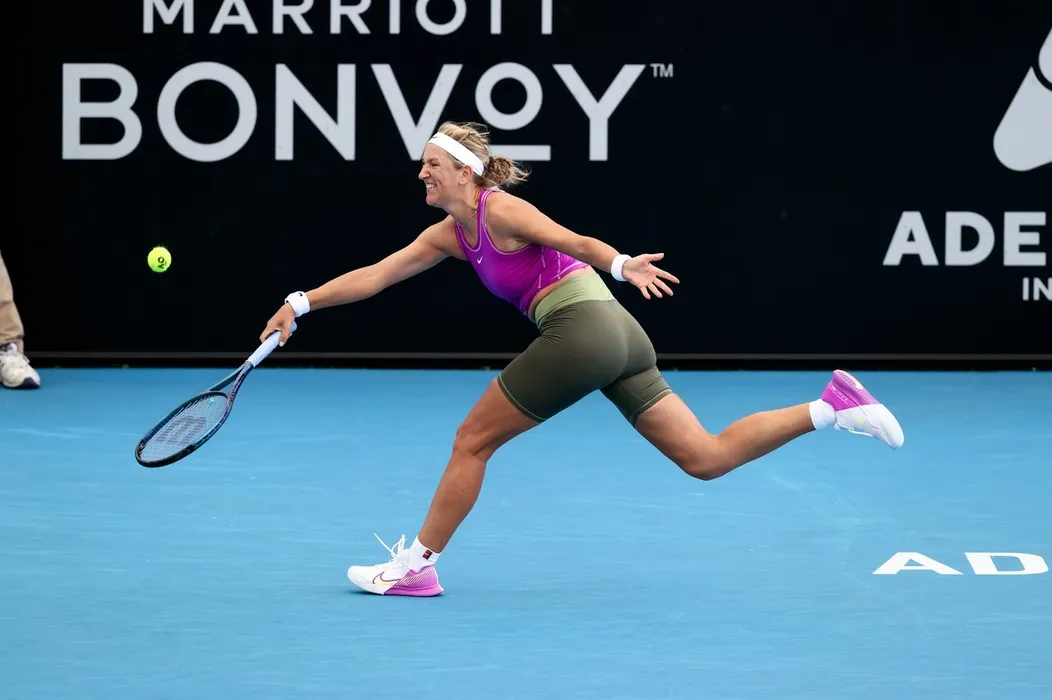 Victoria Azarenka of Belarus plays a forehand during the Adelaide International tennis match between Victoria Azarenka of Belarus and Qinwen Zheng of China at Memorial Drive on January 05, 2023 in Adelaide, Australia.