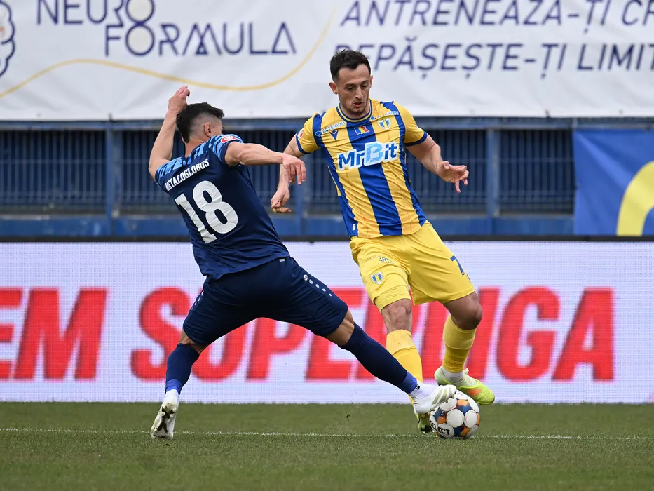 Mircea Alexandru Tirlea si Franjo Prce in meciul de fotbal dintre Metaloglobus Bucuresti si Petrolul Ploiesti, contand pentru Play out-ul Superligii Superbet, desfasurat pe Clinceni Arena din Clinceni, sambata 21 martie 2026. © FOTO:Razvan Pasarica/SPORT PICTURES