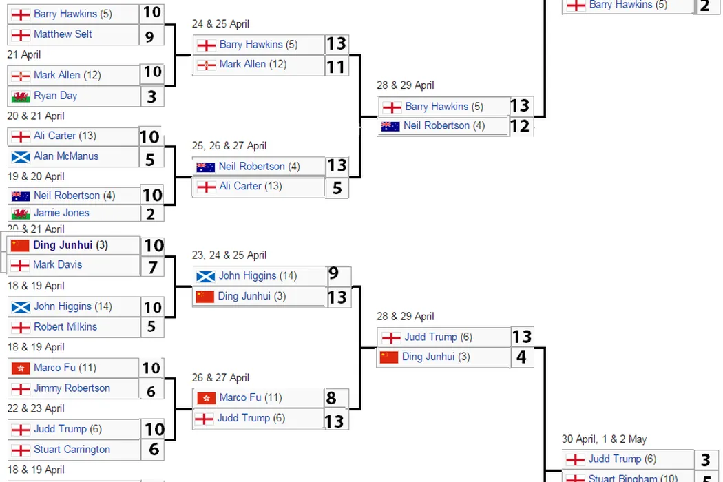 După ce l-a eliminat pe Ronnie O’Sullivan, Stuart Bingham îl conduce și pe Judd Trump în semifinalele Mondialului de snooker. Murphy are meci ușor cu Hawkins