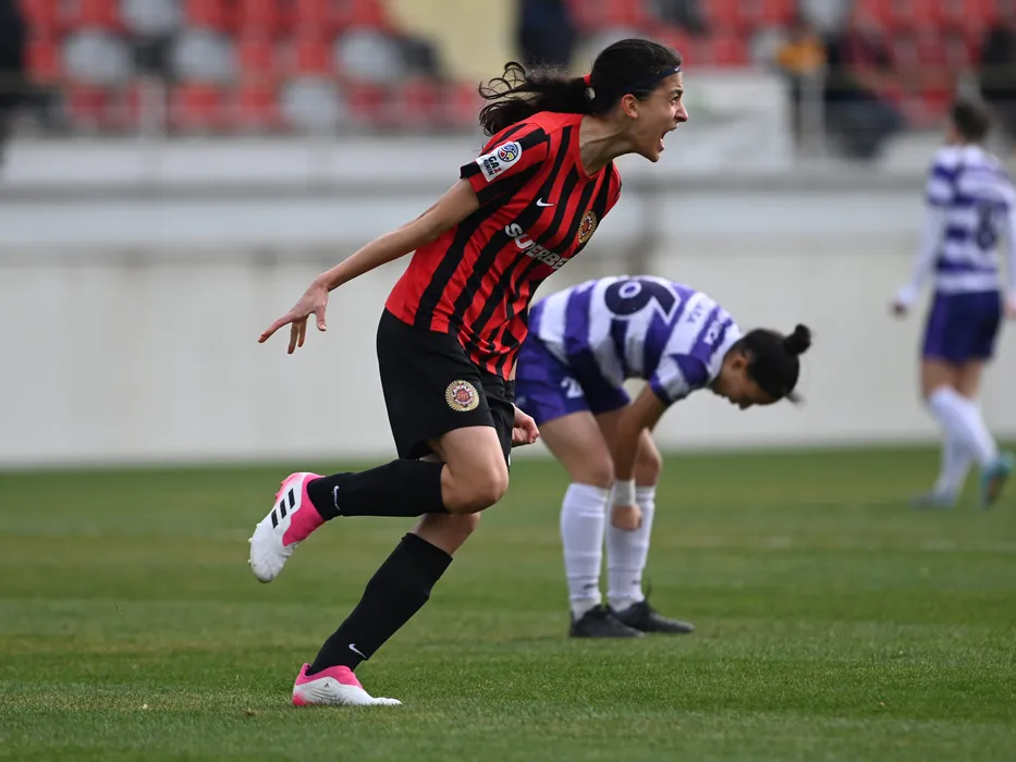 Rania Kara Youli se bucura dupa un gol marcat in meciul de fotbal feminin dintre Carmen Bucuresti si Politehnica Timisoara, contand pentru Play-off-ul Ligii 1, desfasurat pe Stadionul Marin Anastasovici din Giurgiu, sambata 4 martie 2023. © FOTO:Razvan Pasarica/SPORT PICTURES