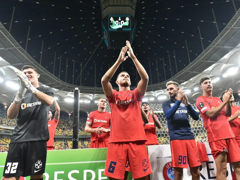 Fotbalistii stelisti Stefan Tarnovanu, Denis Gratian Harut, Gheorghe Bogdan Rusu si David Raul Miculescu saluta galeria dupa meciul de fotbal dintre FCSB si RSC Anderlecht Bruxelles, din cadrul grupelor UEFA Europa Conference League, desfasurat pe Arena Nationala din Bucuresti, joi 15 septembrie 2022. © FOTO:Razvan Pasarica/SPORT PICTURES
