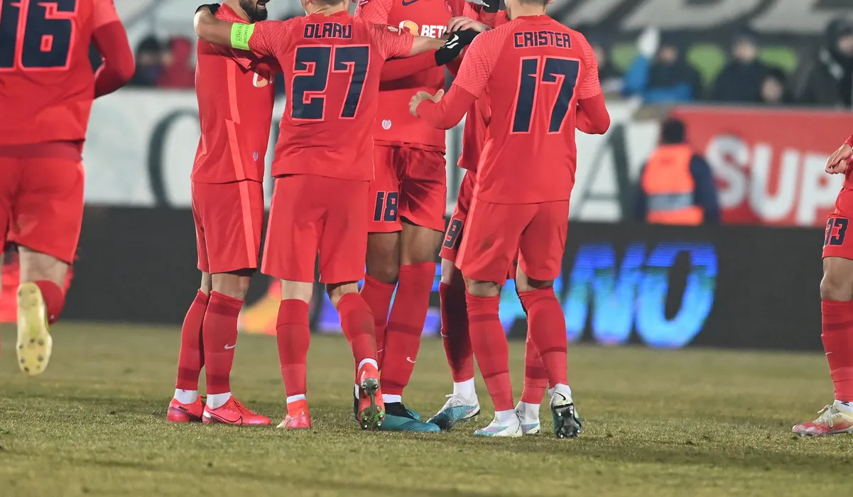 Bucurie a fotbalistilor stelisti dupa un gol marcat cu Valentin Cretu, Sylas Laouari Edjouma Malcom si Iulian Lucian Cristea la meciul de fotbal dintre FC Voluntari si FCSB, contand pentru Superliga Superbet, desfasurat pe Stadionul Anghel Iordanescu din Voluntari, duminica 12 februarie 2023. © FOTO:Razvan Pasarica/SPORT PICTURES