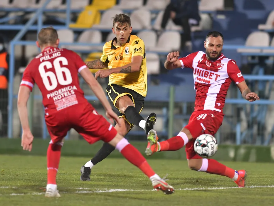 Ivan Pesic si Florin Bejan in meciul de fotbal dintre FC Voluntari si Dinamo Bucuresti, contand pentru Liga 1 Casa Pariurilor, desfasurat fara spectatori pe Stadionul Anghel Iordanescu din Voluntari, luni 8 martie 2021. © FOTO:Razvan Pasarica/SPORT PICTURES