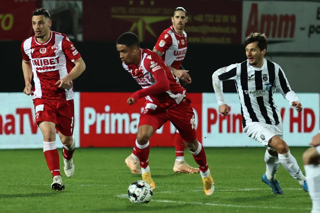 Sahr Jonathan Morsay si Paul Viorel Anton in meciul de fotbal dintre Astra Giurgiu si Dinamo Bucuresti, contand pentru Liga 1 Casa Pariurilor, desfasurat fara spectatori pe Stadionul Marin Anastasovici din Giurgiu, vineri 16 aprilie 2021. © FOTO:Gheorghe Fluster/SPORT PICTURES