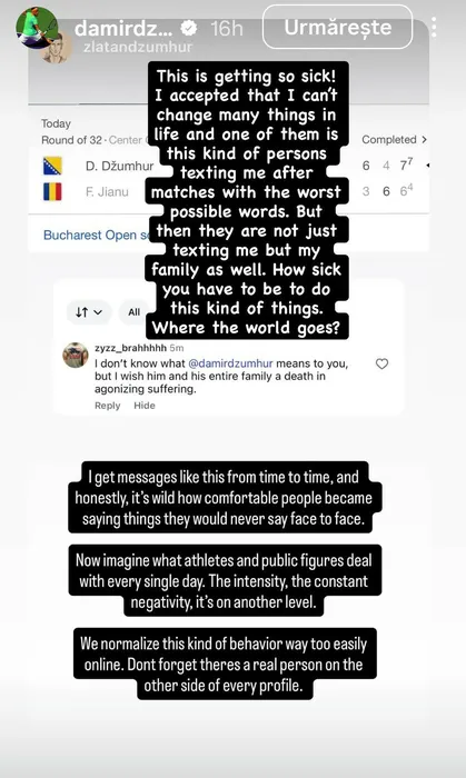 Neverosimil! Bosniacul Dzumhur a primit mesaje abominabile după victoria de la București cu românul Jianu: „Cât de bolnav să fii să îi scrii și familiei mele?”