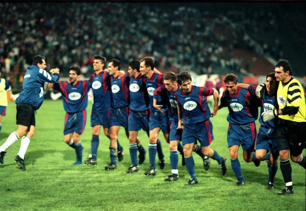 Bucurie a fotbalistilor stelisti cu Daniel Gherasim,Marius Lacatus,Tiberiu Csik,Roland Nagy,Marius Baciu,Valeriu Rachita,Denis Serban,Iosif Rotariu,Lavi Hrib,Catalin Munteanu si Zoltan Ritli.