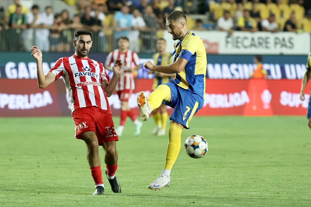 Gheorghe Teodor Grozav si Benjamin Andre P Van Durmen in meciul de fotbal dintre FC Petrolul Ploiesti si UTA Arad, contand pentru Superliga Superbet, desfasurat pe Stadionul Ilie Oana din Ploiesti, vineri 1 august 2025. © FOTO:Gheroghe Fluster/SPORT PICTURES