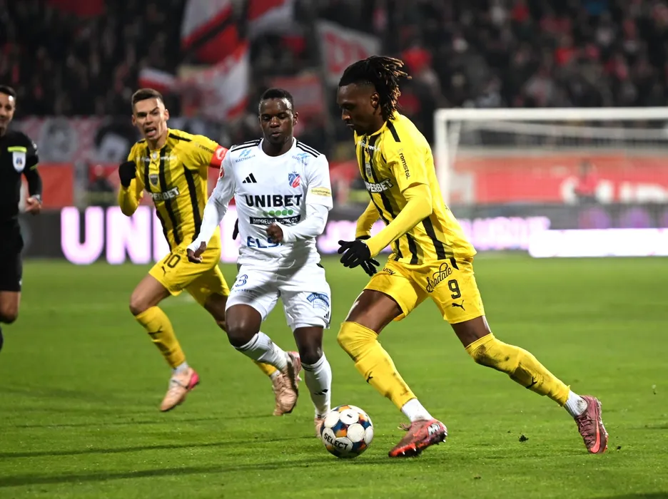 Mamoudou Karamoko si Charles Petro in meciul de fotbal dintre FC Botosani si Dinamo Bucuresti, contand pentru Superliga Superbet, desfasurat pe Stadionul Municipal din Botosani, luni 24 noiembrie 2025. © FOTO:Tudy/SPORT PICTURES