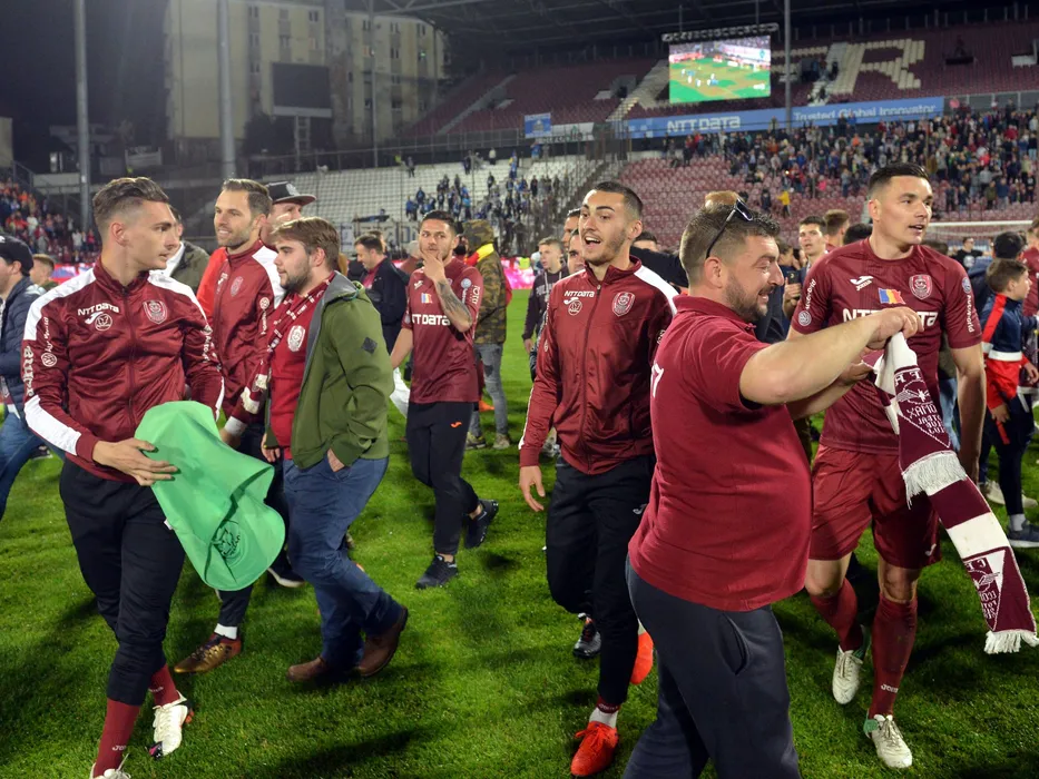 Fotbalistii de la CFR Andrei Peteleu si Ovidiu Hoban se bucura se bucura alaturi de suporteri dupa castigarea titlului de campioana alaturi de trofeu in urma meciului de fotbal dintre CFR Cluj si Universitatea Craiova, din cadrul playoff-ului Ligii 1 Betano, desfasurat pe Stadionul Dr. Constantin Radulescu din Cluj Napoca, duminica 12 mai 2019. © FOTO:Razvan Pasarica/SPORT PICTURES