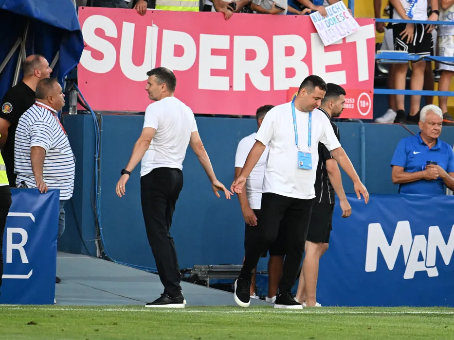 Antrenorii celor doua echipe Laszlo Gyorgy Balint si Ianis Alin Zicu se saluta dupa meciul de fotbal dintre Farul Constanta si Otelul Galati, contand pentru Superliga Superbet, desfasurat pe Stadionul central al Academiei Gheorghe Hagi din Ovidiu, duminica 20 iulie 2025. © FOTO:Razvan Pasarica/SPORT PICTURES