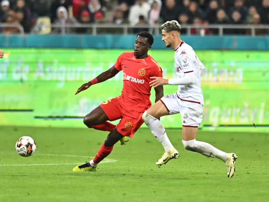 Joyskim Aurelien Dawa Tchakonte si Albion Rrahmani in meciul de fotbal dintre FCSB si Rapid Bucuresti, din cadrul Play off-ului Superligii Superbet, desfasurat pe Arena Nationala din Bucuresti, sambata 20 aprilie 2024. © FOTO:Razvan Pasarica/SPORT PICTURES
