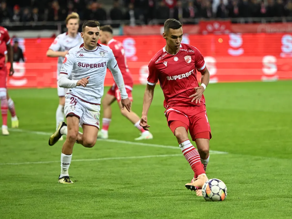 Luka Gojkovic si Catalin Ionut Cirjan in meciul de fotbal dintre Dinamo Bucuresti si Rapid Bucuresti, contand pentru Play off-ul Superligii Superbet, desfasurat pe Arena Nationala din Bucuresti, luni 12 mai 2025. © FOTO:Razvan Pasarica/SPORT PICTURES