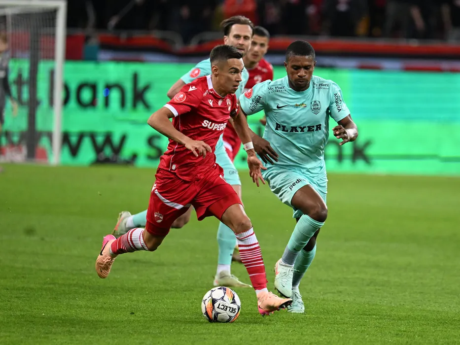 Catalin Ionut Cirjan si Mohammed Kesselly Kamara in meciul de fotbal dintre Dinamo Bucuresti si CFR Cluj, contand pentru Play off-ul Superligii Superbet, desfasurat pe Arena Nationala din Bucuresti, luni 28 aprilie 2025. © FOTO:Razvan Pasarica/SPORT PICTURES