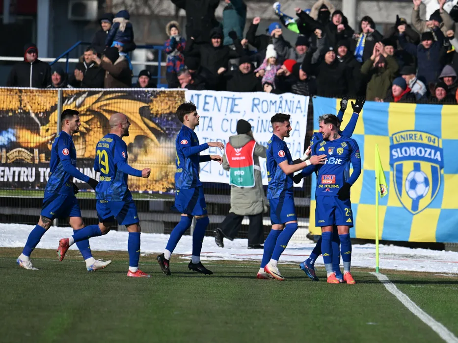 Alexandru Cristian Albu se bucură dupa un gol marcat alături de Daniel Marius Serbanica, Patrick Adrian Dulcea si Andrei Cristian Dorobantu in meciul dintre Unirea Slobozia si UTA Arad, contand pentru Superliga Superbet, desfasurat pe Stadionul 1 Mai din Slobozia, sambata 17 ianuarie 2026. © FOTO:Razvan Pasarica/SPORT PICTURES