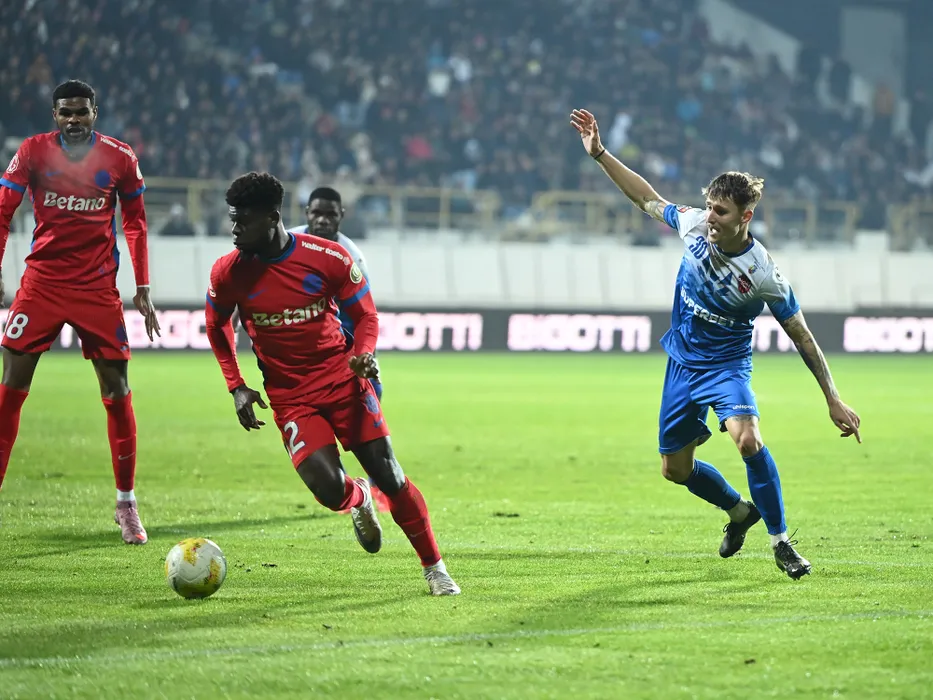 Malcolm Sylas Laouari Edjouma, Enagnon David Kiki si Razvan Alexandru Mogos in meciul de fotbal dintre Gloria Bistrita si FCSB, din cadrul Cupei Romaniei Betano, desfasurat pe Stadionul Jean Padureanu din Bistrita, miercuri 29 octombrie 2025. © FOTO:Razvan Pasarica/SPORT PICTURES