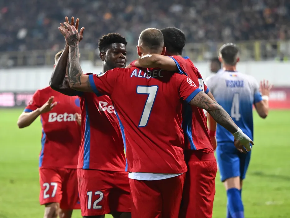 Enagnon David Kiki il felicita pe Denis Alibec dupa un gol marcat in meciul de fotbal dintre Gloria Bistrita si FCSB, din cadrul Cupei Romaniei Betano, desfasurat pe Stadionul Jean Padureanu din Bistrita, miercuri 29 octombrie 2025. © FOTO:Razvan Pasarica/SPORT PICTURES