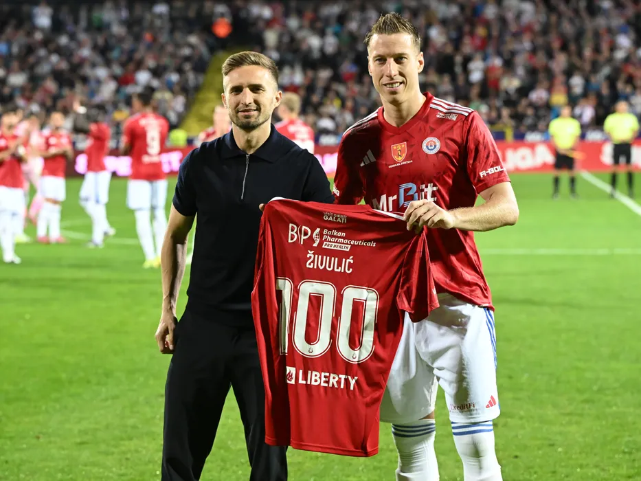 Diego Zivulic primeste din partea lui Ionut Neagu un tricou cu numarul 100, prezentele sale in primaliga, inaintea meciului dintre Otelul Galati si Universitatea Craiova, contand pentru Superliga Superbet, desfasurat pe Stadionul Otelul din Galati, sambata 20 septembrie 2025. © FOTO:Razvan Pasarica/SPORT PICTURES