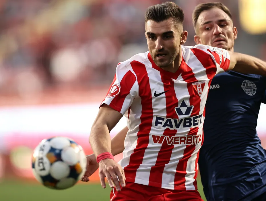 Marius Catalin Coman si George Alexandru Caramalau in meciul de fotbal dintre UTA Arad si FC Metaloglobus Bucuresti contand pentru Superliga Superbet, desfasurat pe Arena Francisc Neuman din Arad, duminica 2 noiembrie 2025. © FOTO:Sebastian Tataru/SPORT PICTURES