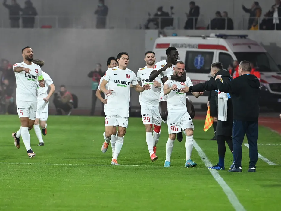 Bucurie a fotbalistilor sibieni dupa un gol marcat cu Florin Bejan, Paul Marius Antoche, Ciprian Ionut Biceanu, Paul Marius Antoche su Silviu Nicolae Balaure in meciul de fotbal dintre FC Hermannstadt si Farul Constanta, contand pentru Superliga Superbet, desfasurat pe Stadionul Municipal din Sibiu, sambata 10 decembrie 2022. © FOTO:Razvan Pasarica/SPORT PICTURES
