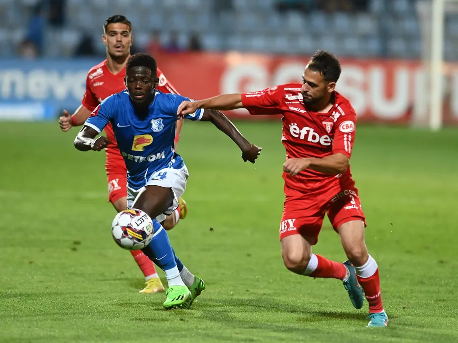 Kevin Doukoure Grobry si Mihai Dobrescu in meciul de fotbal dintre Farul Constanta si UTA Arad, contand pentru Superliga Superbet, desfasurat pe Stadionul central al Academiei Gheorghe Hagi din Ovidiu, duminica 2 octombrie 2022. © FOTO:Razvan Pasarica/SPORT PICTURES