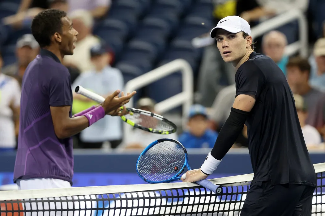 MASON, OHIO - AUGUST 16: Felix Auger-Aliassime of Canada and Jack Draper of Great Britain meet at the net after a controversial match-ending point during Day 6 of the Cincinnati Open at the Lindner Family Tennis Center on August 16, 2024 in Mason, Ohio. Matthew Stockman,Image: 899351495, License: Rights-managed, Restrictions: , Model Release: no