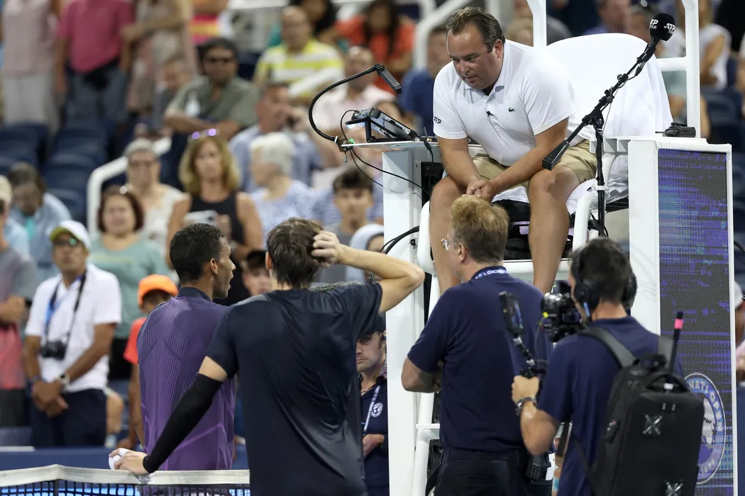 MASON, OHIO - AUGUST 16: Chair umpire Greg Allensworth explains a controversial match-ending point to Felix Auger-Aliassime of Canada and Jack Draper of Great Britain during Day 6 of the Cincinnati Open at the Lindner Family Tennis Center on August 16, 2024 in Mason, Ohio. Matthew Stockman,Image: 899351913, License: Rights-managed, Restrictions: , Model Release: no