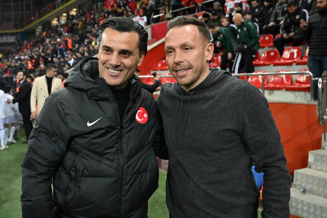 KAYSERI, TURKIYE - NOVEMBER 16: Head coach of Turkiye Vincenzo Montella (L) wishes Wales coach Craig Bellamy success prior to the UEFA Nations B League Group 4 match between Turkiye and Wales at RGH EnerTurk Enerji Stadium in Kayseri, Turkiye on November 16, 2024. Sercan Kucuksahin / Anadolu/ABACAPRESS.COM