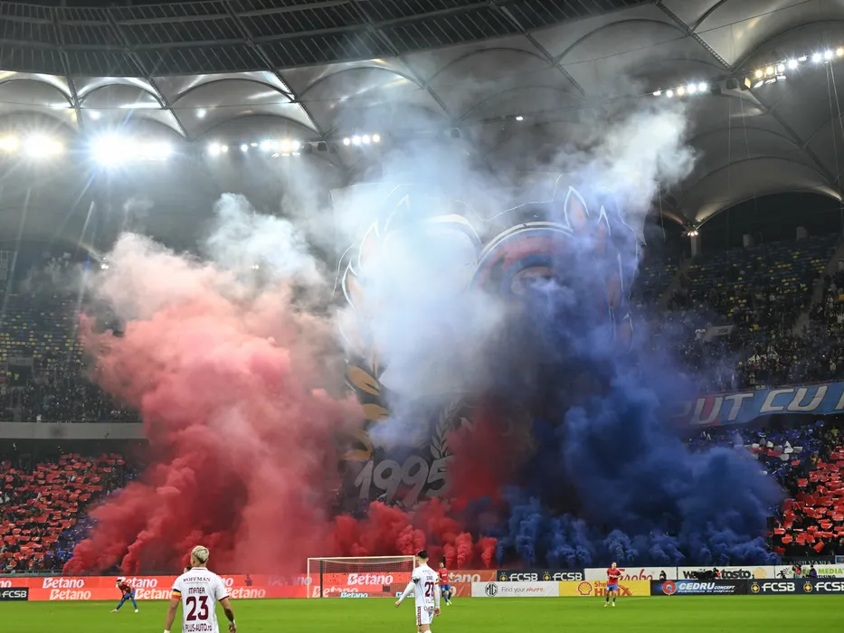 Coregrafie ros albastra cu fumigene prezentata in peluza la meciul dintre FCSB si Rapid Bucuresti, contand pentru Superliga Superbet, desfasurat pe Arena Nationala din Bucuresti, duminica 21 decembrie 2025. © FOTO:Razvan Pasarica/SPORT PICTURES